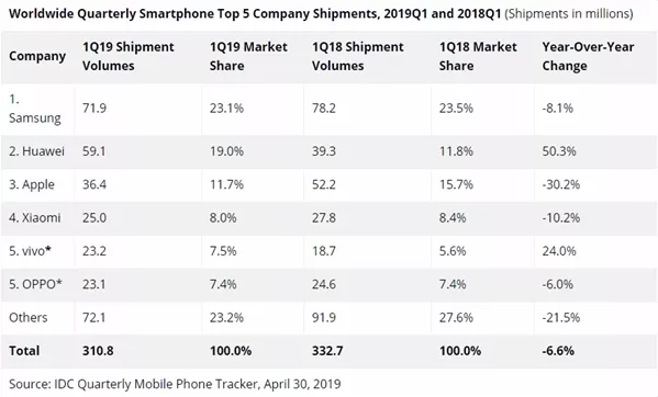 2019年第一季度全球手机出货量变化(图片来源:IDC)